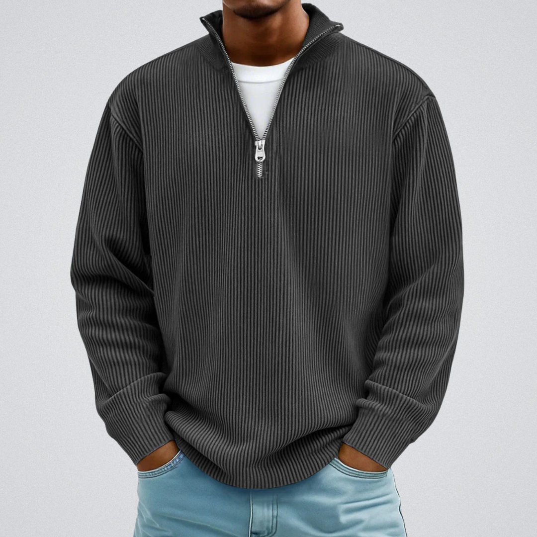 🔗 Raffineret detalje: En halvhøj lynlåskrave og en tekstureret strik tilføjer et maskulint og distingveret præg til dit look.